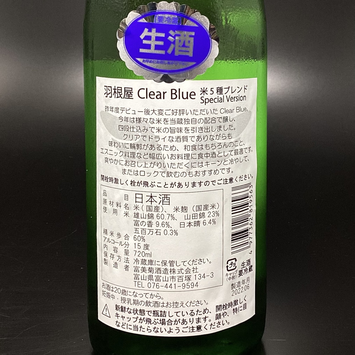 《特約店・特別数量限定品》羽根屋 Clear Blue 純米吟醸(生) 720ml