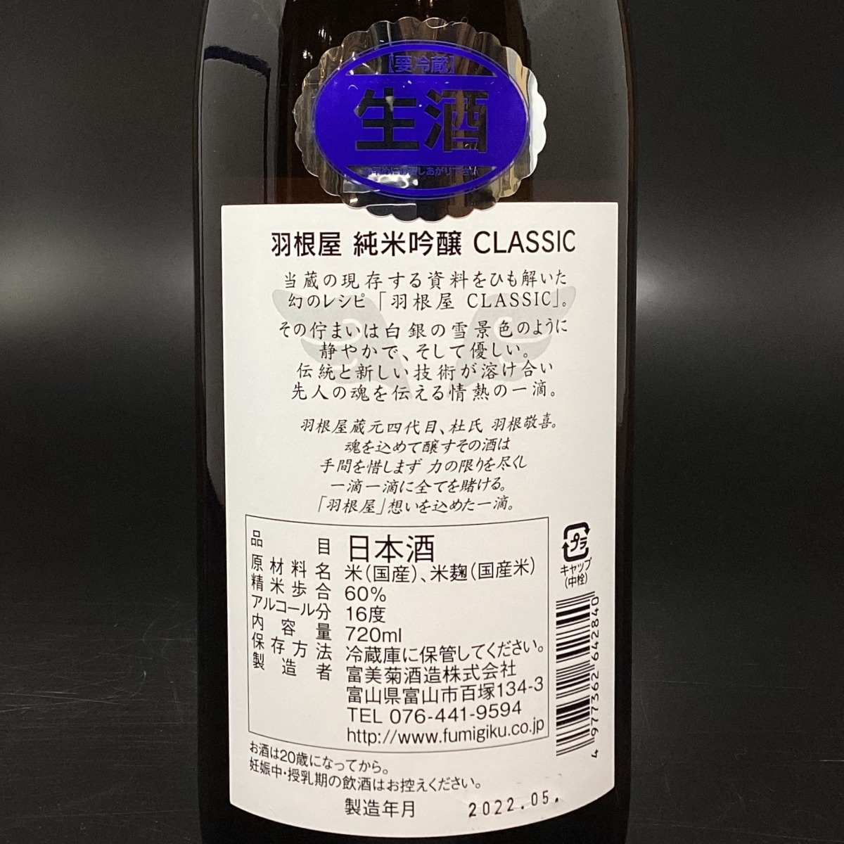 《特約店限定》羽根屋 CLASSIC 純米吟醸 生 720ml